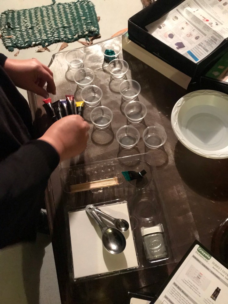 First, these crafts have everything you need in them to get your craft done. The only thing extra I needed for the paint-pour crafts was water and a measuring spoon, THAT’S IT, everything else was covered. The paint- pour set was easy and fun but can be a little messy so make sure you do it outside or in an area you don’t mind getting paint.